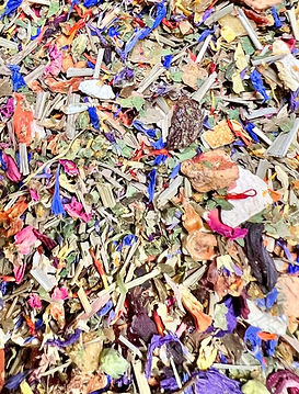Sultanas, Apfelstücke, Mangowürfel, Zitronengras, Hagebuttenschalen, Hibiskusblüten, Orangenschalen, Karottenraspeln, Brennesselblätter, süße Brombeerblätter, gefr.-getr. Mandarinenorangenstücke, Kornblumen, Malvenblüten, Ringelblumen, Rosenblüten, Rosenknospen, Färberdisteln